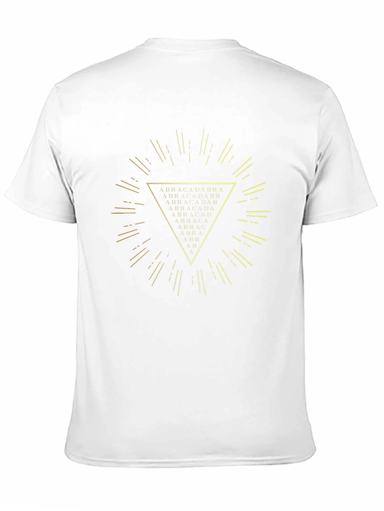 Embrace mystical style with this black graphic tee. Featuring a golden, sunburst-style triangle enclosing the word "Abracadabra" in a diminishing formation, this shirt adds an enigmatic flair to any outfit. The eye-catching design is printed on a comfortable, relaxed-fit tee, making it perfect for casual wear or showcasing your unique personality. Pair it with jeans for an everyday look or dress it up with a blazer for a night out. This magical tee is sure to spark conversations and turn heads wherever you go.