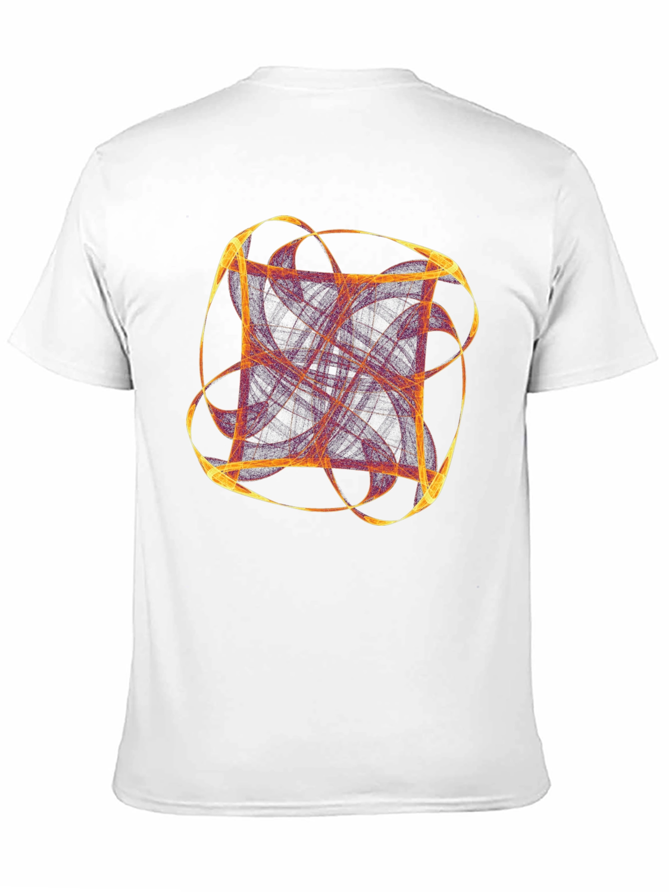 This stylish black t-shirt features a vibrant abstract graphic design on the front. The design consists of interlacing lines and geometric shapes in shades of orange and purple, creating a visually striking and modern look. The shirt appears to be made from a soft, comfortable cotton blend, making it perfect for everyday wear. Its classic crew neck and short sleeve construction make it a versatile addition to any wardrobe. Wear it casually with jeans or dress it up with a jacket for a more polished look. It's a cool way to express your unique style. Great for any occasion.