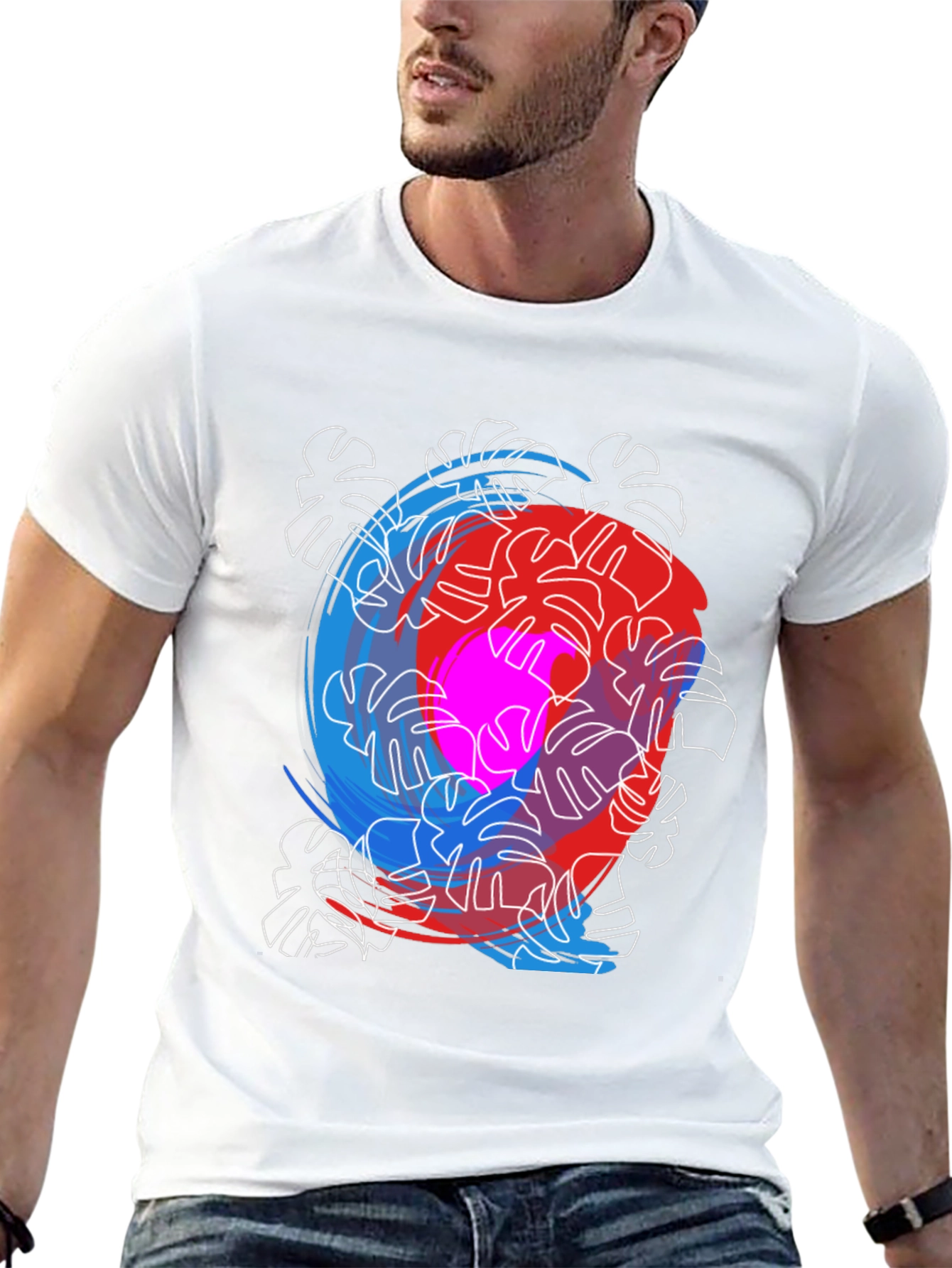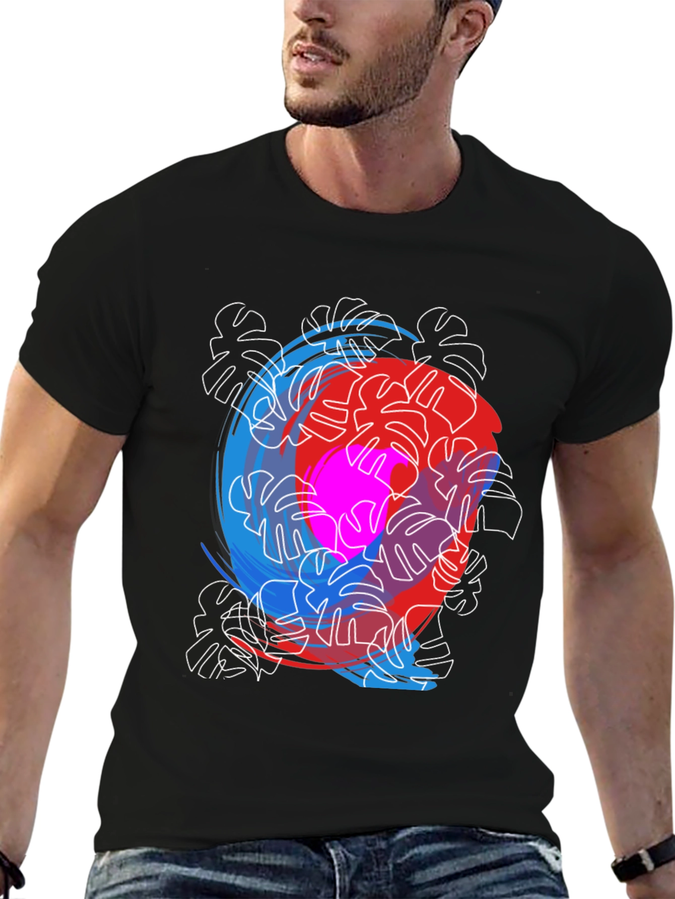 Show off your unique style with this eye-catching black t-shirt. The design features an abstract graphic of monstera leaves outlined in white, overlaying a vibrant blend of red, pink, and blue circular shapes. The soft fabric ensures a comfortable fit for everyday wear. Perfect for casual outings, concerts, or simply expressing your artistic side. Make a statement with this bold and contemporary design that's sure to turn heads. This tee is a must-have for any modern wardrobe.