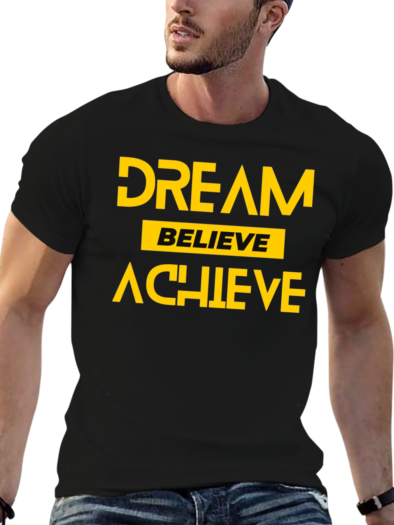Inspire yourself and others with this motivational graphic t-shirt. Featuring the words "Dream Believe Achieve" in bold yellow lettering on a black tee, this shirt is made from what appears to be a soft, comfortable cotton blend. The classic fit and short sleeves make it perfect for everyday wear, whether you're hitting the gym, running errands, or just relaxing at home. Let this t-shirt serve as a daily reminder to chase your dreams and never give up. Dress it up with a jacket or keep it casual with jeans - its versatility makes it a great addition to any wardrobe.
