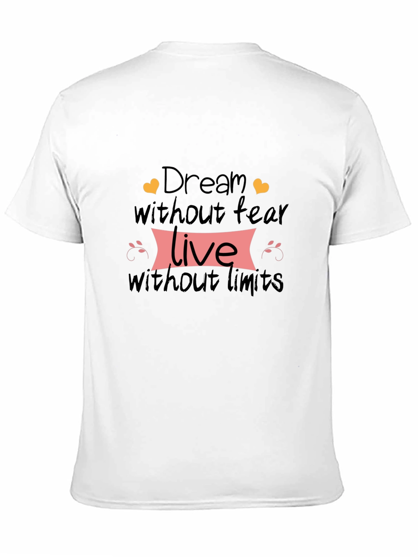 This classic black t-shirt features an inspirational graphic print on the chest. The design includes the words "Dream without fear, Live without limits", adorned with heart accents and decorative flourishes. Made from a soft-looking fabric, this tee offers both comfort and style. The simple design makes it versatile for everyday wear, from casual outings to relaxed evenings at home. It's a perfect way to showcase your positive attitude. Great for gifting or adding to your own wardrobe!