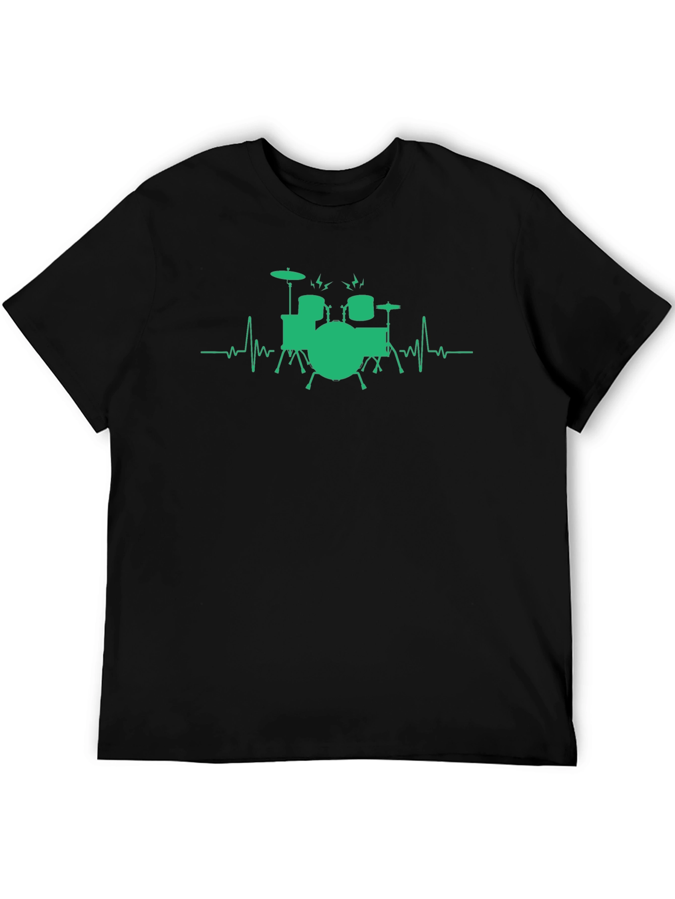 Rock your style with this unique black t-shirt featuring a vibrant green drum set graphic. The design incorporates a creative heartbeat rhythm, showcasing a passion for music. Made from a comfortable-looking fabric, this tee is ideal for musicians, music lovers, or anyone with a cool sense of style. Whether you're hitting a concert, jamming with friends, or just hanging out, this t-shirt will make a statement. Show off your love for drumming and stand out from the crowd. Comfortable fit, eye-catching design.