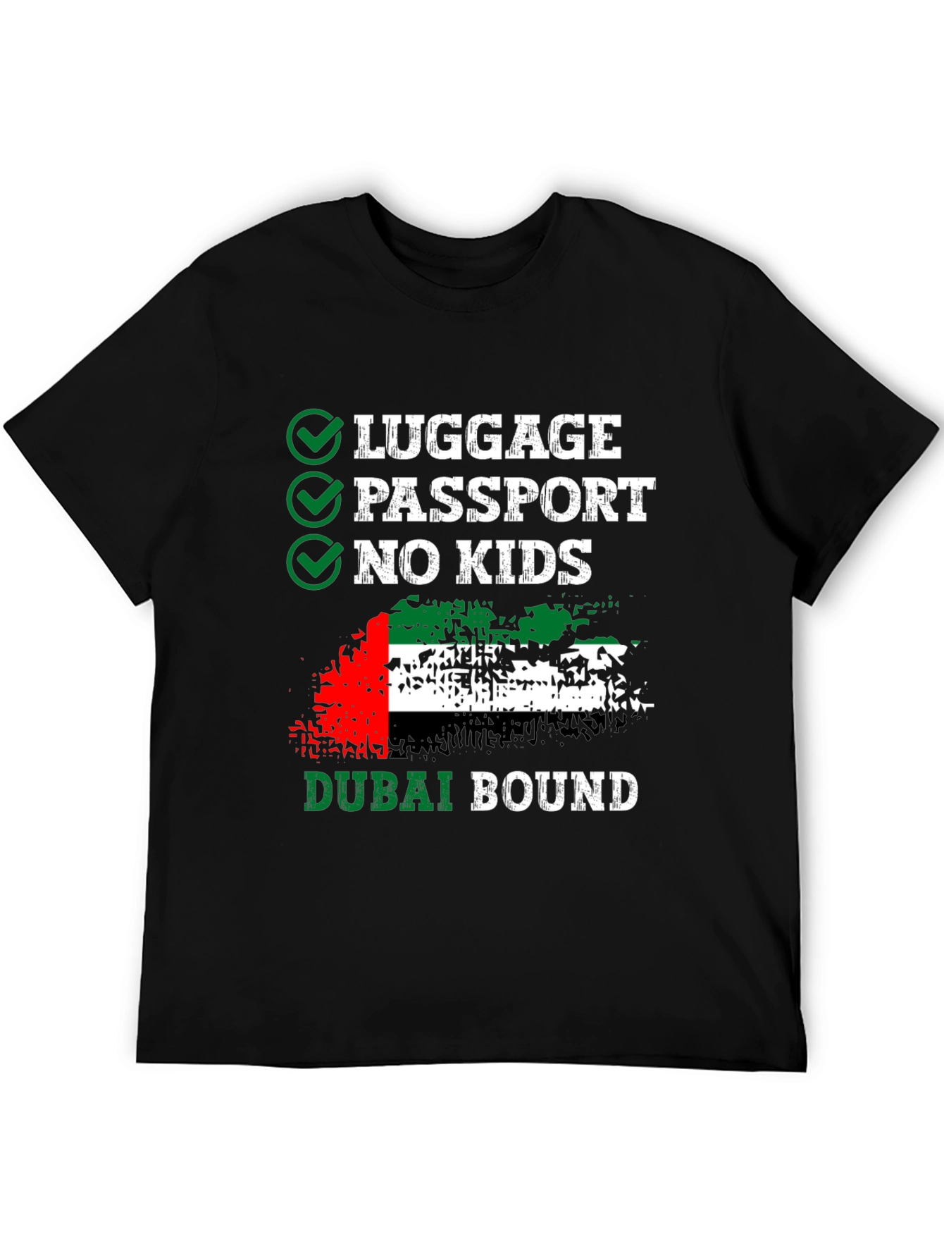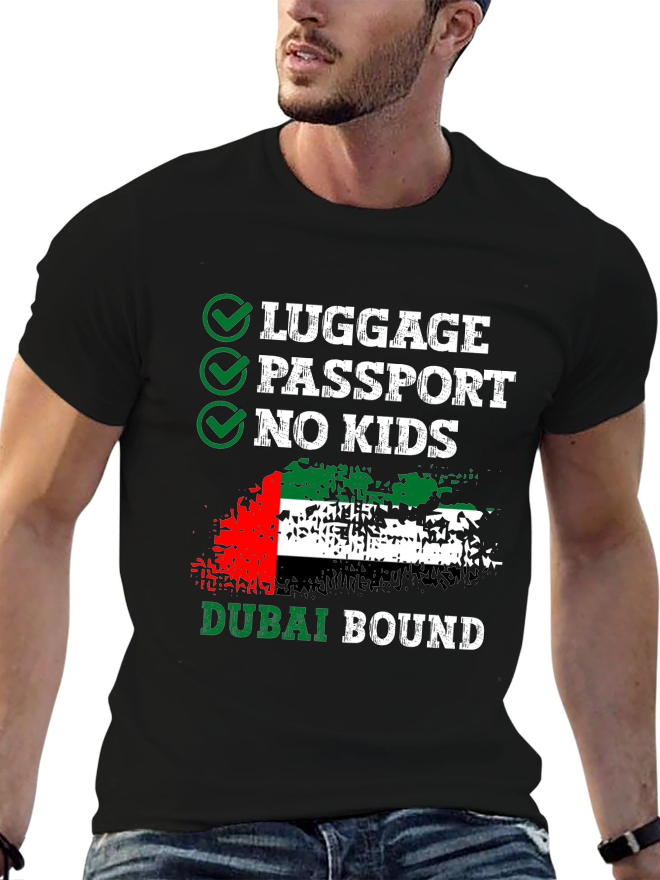 Jet set in style with this fun 'Dubai Bound' T-shirt. This black tee features a checklist design with green checkmarks next to 'Luggage', 'Passport', and 'No Kids', followed by the stylized UAE flag and 'Dubai Bound'. Perfect for globetrotters, tourists, or anyone dreaming of a Dubai vacation. Show off your love for travel with this unique and eye-catching t-shirt. Comfortable and stylish, it's ideal for casual wear, vacation photos, or as a souvenir. Make a statement wherever you go!