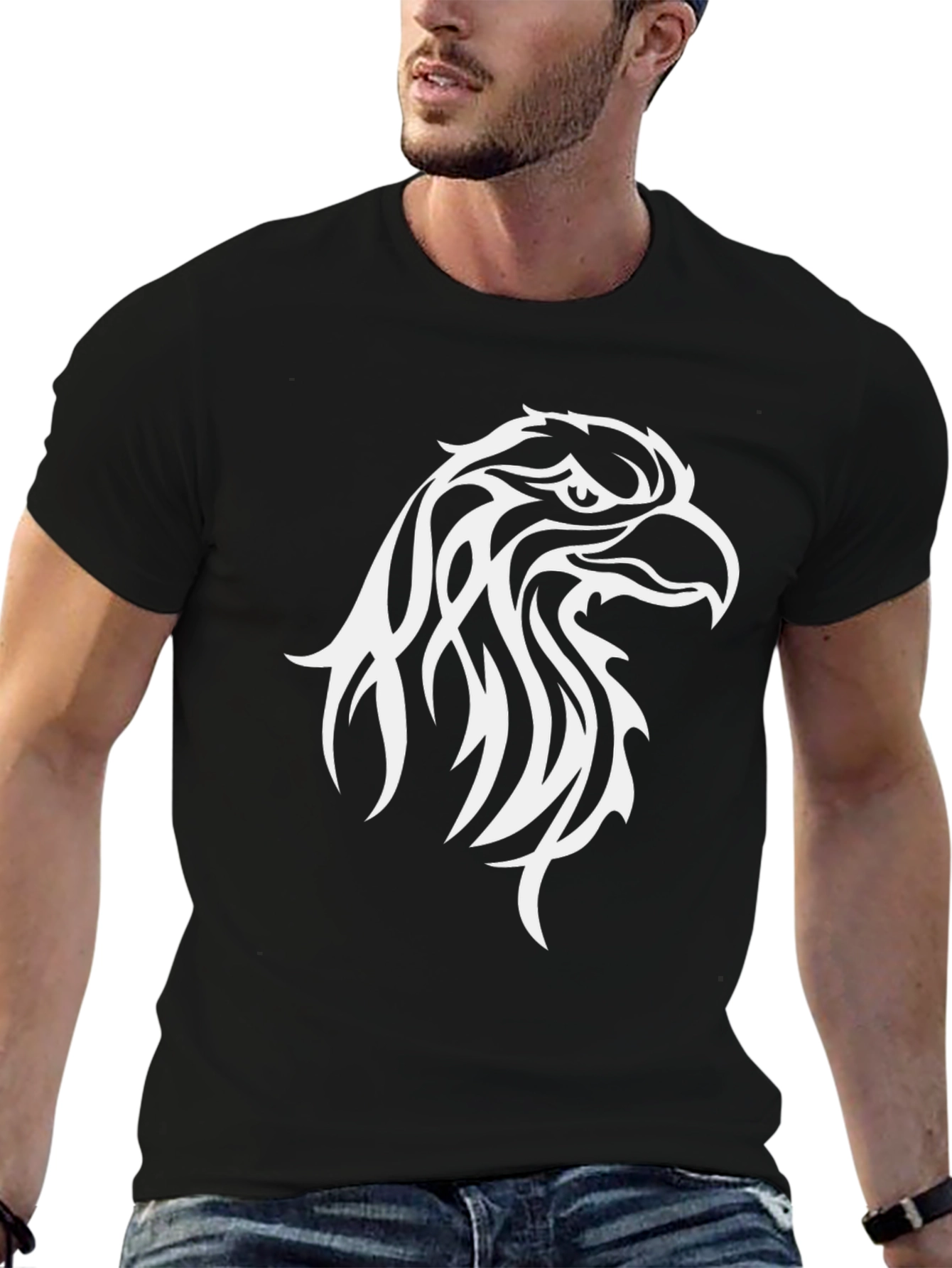 This classic black t-shirt features a striking white tribal-style eagle head graphic. The bold design makes a statement, perfect for expressing individuality. Constructed from a comfortable-looking material, this t-shirt offers both style and ease of wear. The short sleeves and crew neck provide a relaxed fit. Ideal for casual outings, concerts, or everyday wear, this t-shirt effortlessly combines comfort and eye-catching design. Add this unique piece to your wardrobe for a touch of fierce style.
