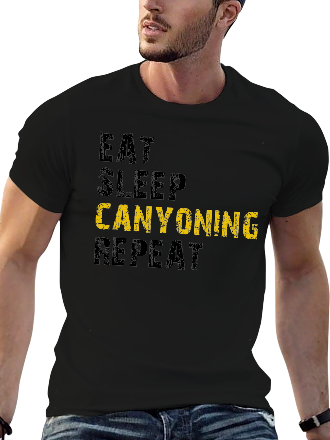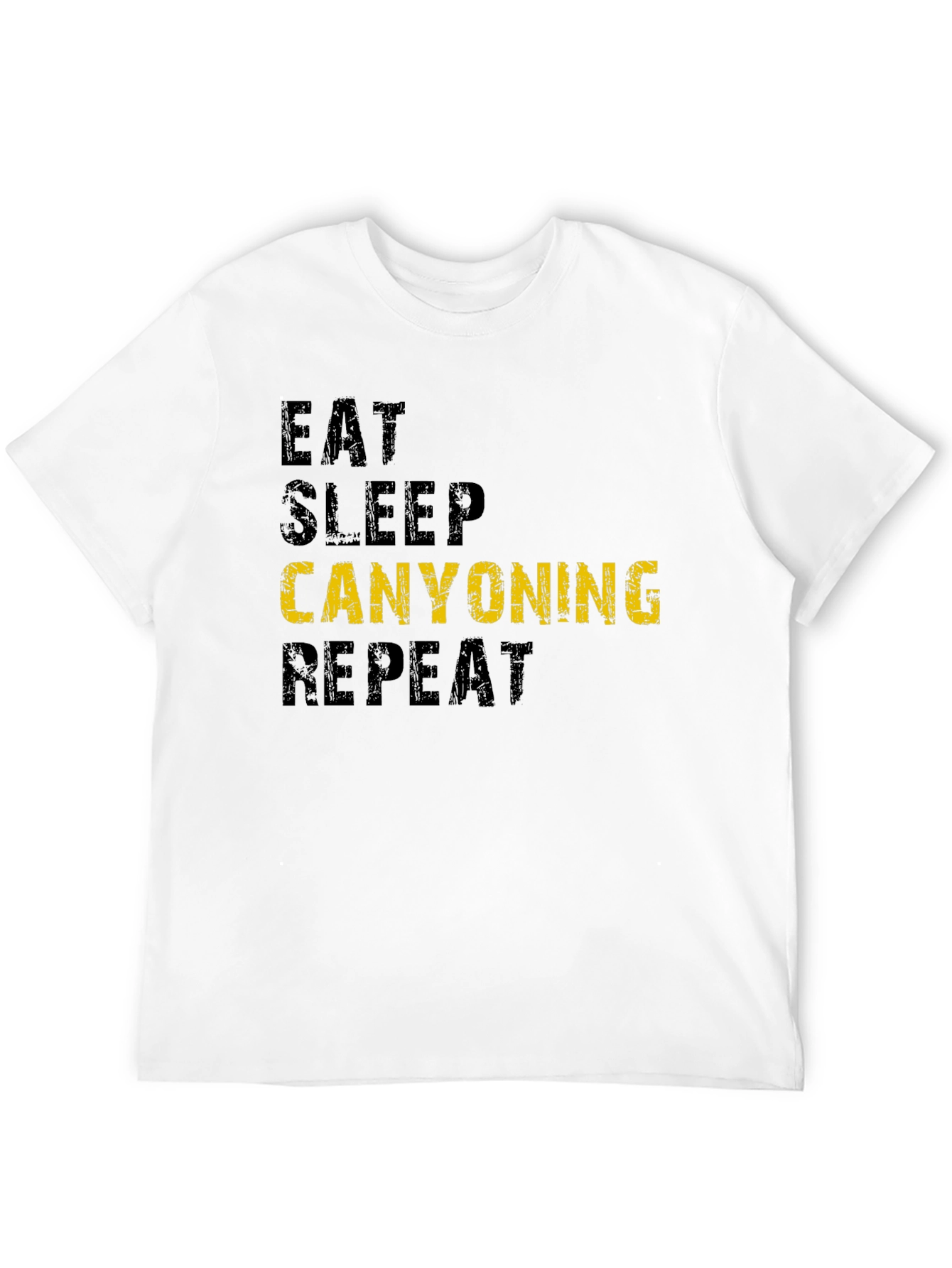 This black t-shirt features the humorous text "Eat Sleep Canyoning Repeat" in a stacked format. The words "Eat", "Sleep", and "Repeat" are in a distressed dark gray, while the word "Canyoning" is highlighted in yellow for emphasis. The shirt appears to be made of a comfortable, breathable cotton or cotton blend. This shirt is perfect for canyoning enthusiasts to wear during their outdoor adventures or as casual wear to express their passion. It also makes a great gift for any canyoning lover!