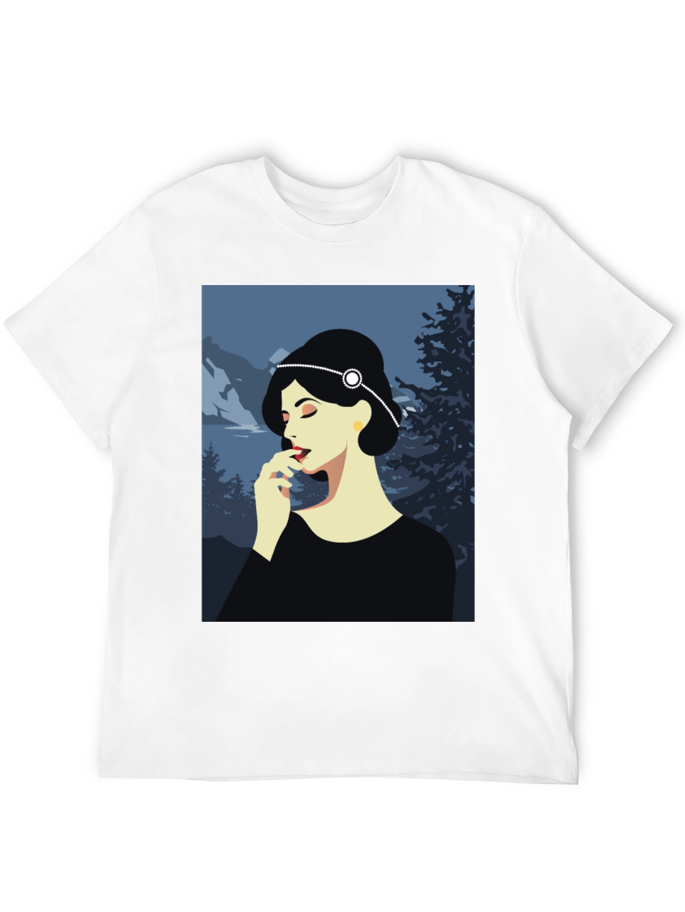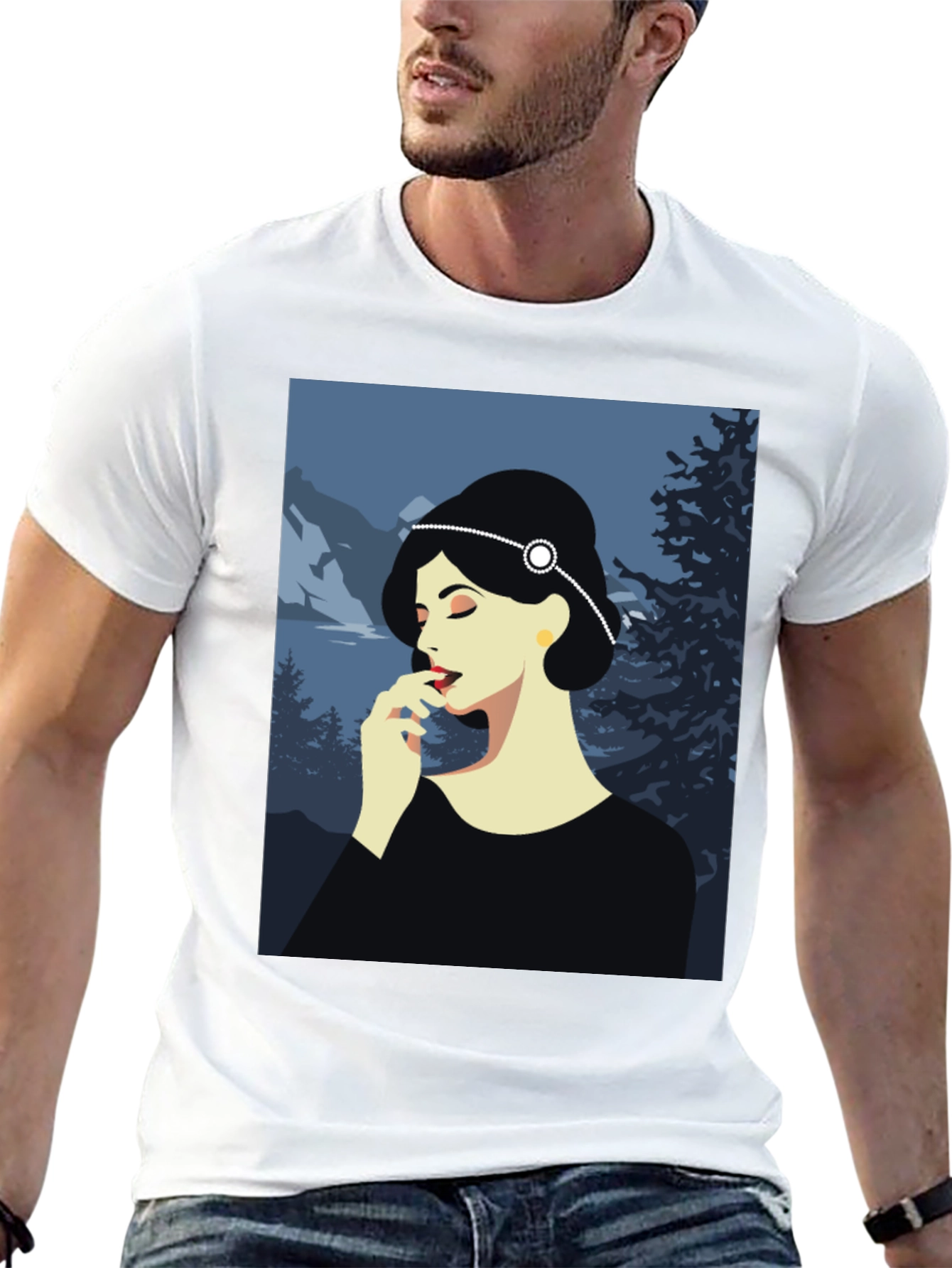 Elevate your style with this striking black t-shirt featuring an elegant art print. The design showcases a woman in a classic pose against a moody landscape, rendered in a sophisticated illustrative style. The shirt appears to be made of a comfortable, soft fabric, making it ideal for everyday wear. The print's minimalist yet impactful design makes this tee a standout piece, perfect for art lovers and those who appreciate unique fashion. Pair it with jeans or dress pants for a versatile look that's both casual and chic. A must-have addition to any modern wardrobe.