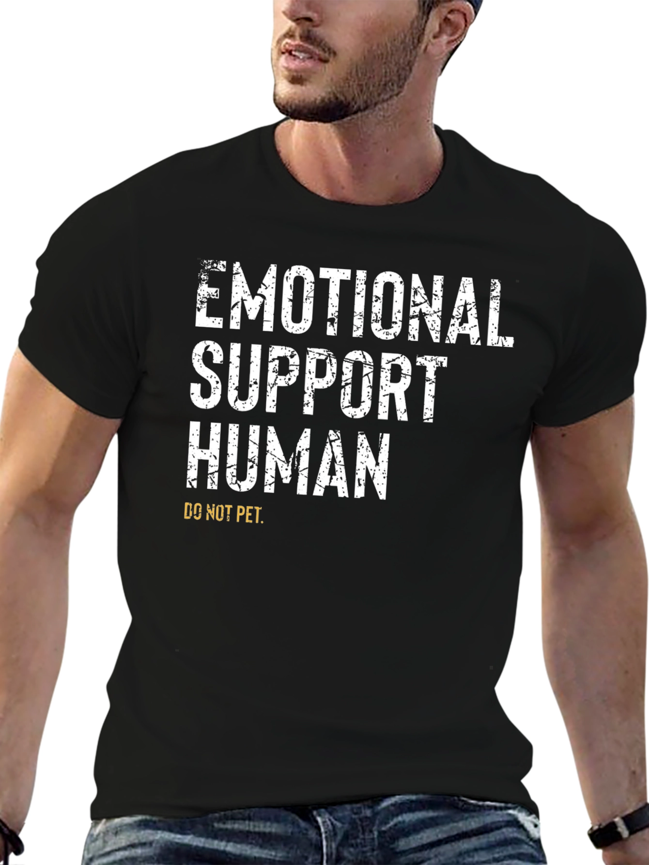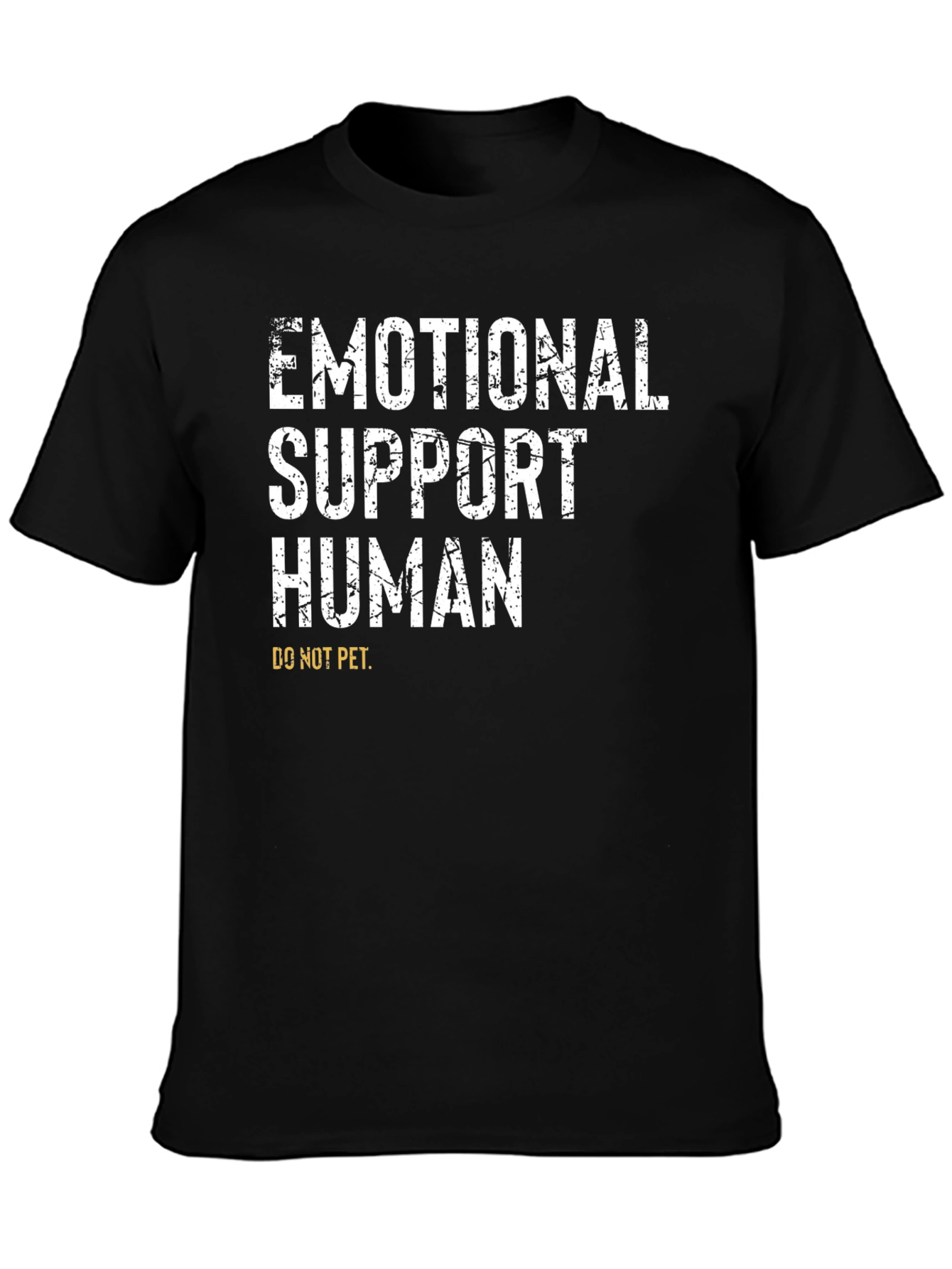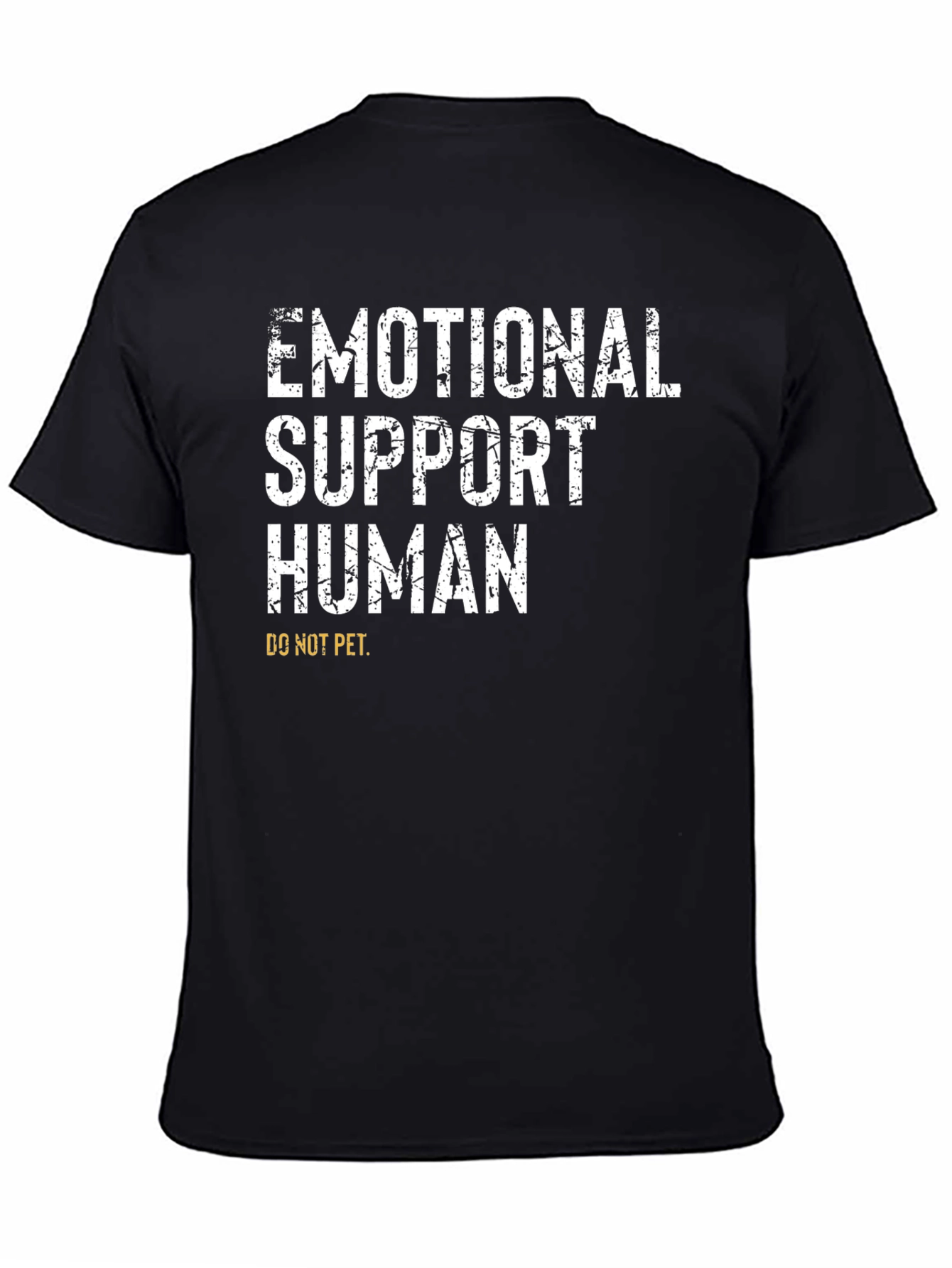 Declare your support status with this bold statement t-shirt. Made from comfortable, breathable fabric, this tee features the phrase "EMOTIONAL SUPPORT HUMAN" in a distressed white font, making it instantly eye-catching. Below the main text, "DO NOT PET" is printed in yellow, adding a humorous twist. The classic black color makes it versatile for everyday wear, while the unique design makes it a fun conversation starter. Wear it to social gatherings, casual outings, or anywhere you want to spread some laughter and emotional support. A perfect gift for the empathetic soul.