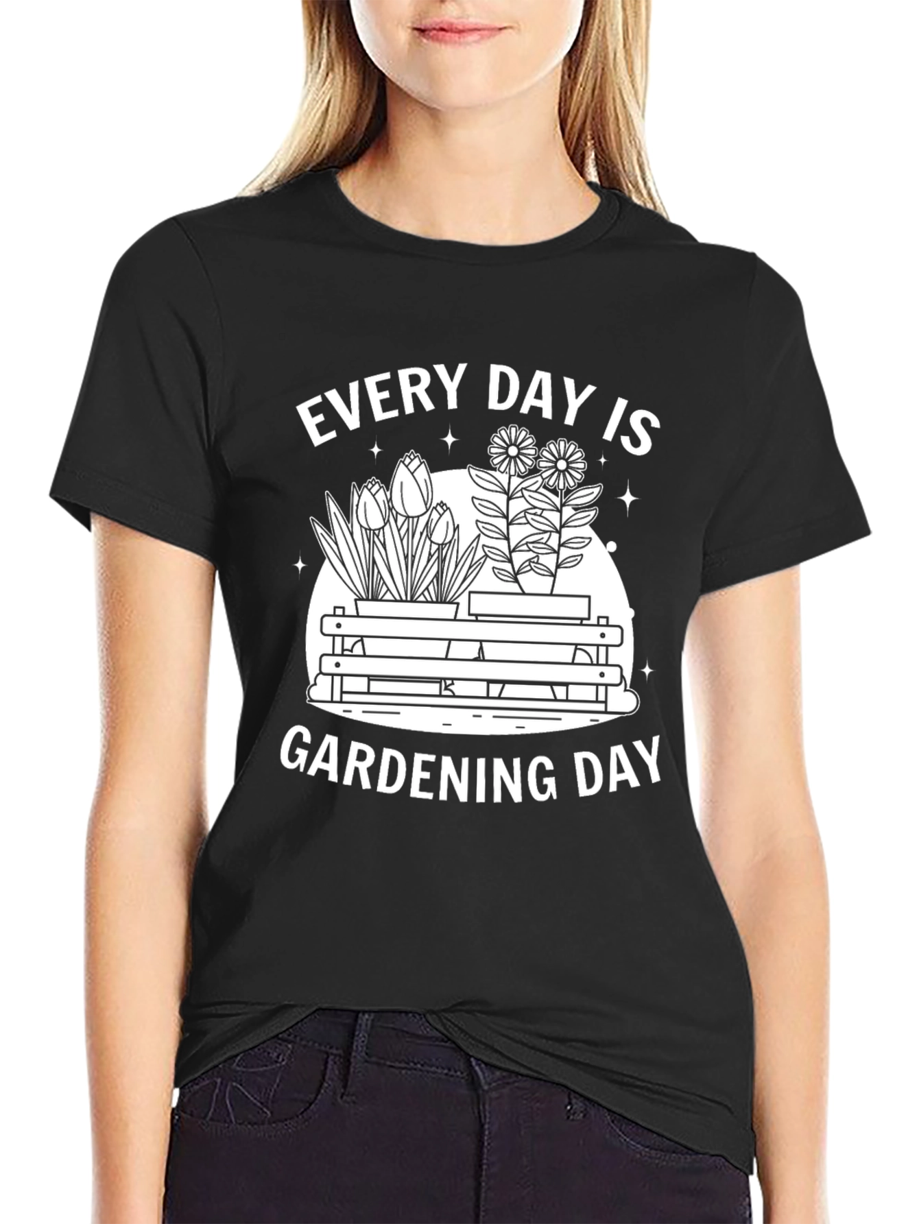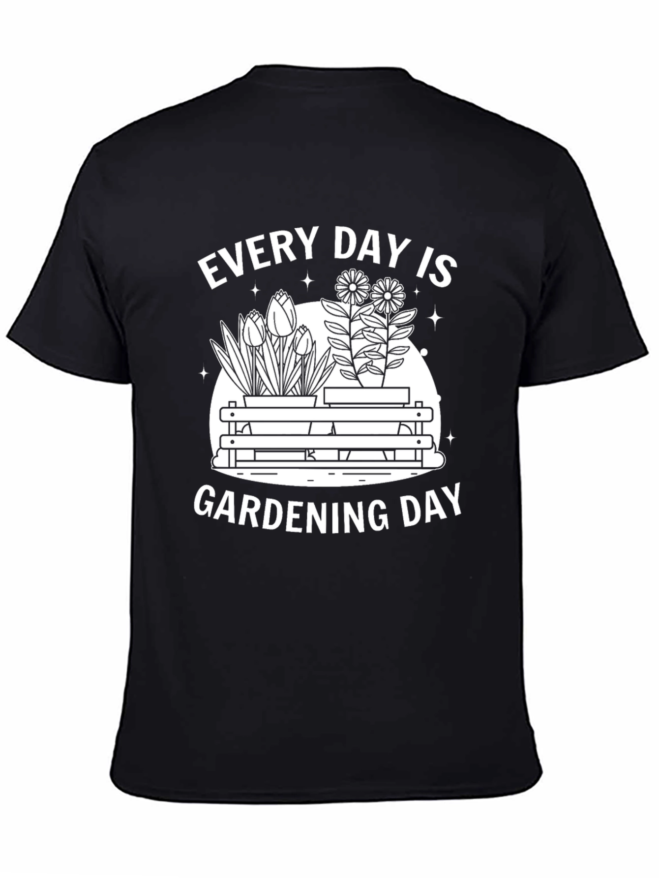 Show off your love for gardening with this stylish black t-shirt! The design features the phrase "Every Day Is Gardening Day" above and below an illustration of plants in a garden setting. This classic fit tee is made from a soft, comfortable fabric, perfect for wearing while you're out in the garden or relaxing at home. It's a great way to express your passion for all things green and makes a thoughtful gift for the gardening enthusiast in your life. Available in various sizes.