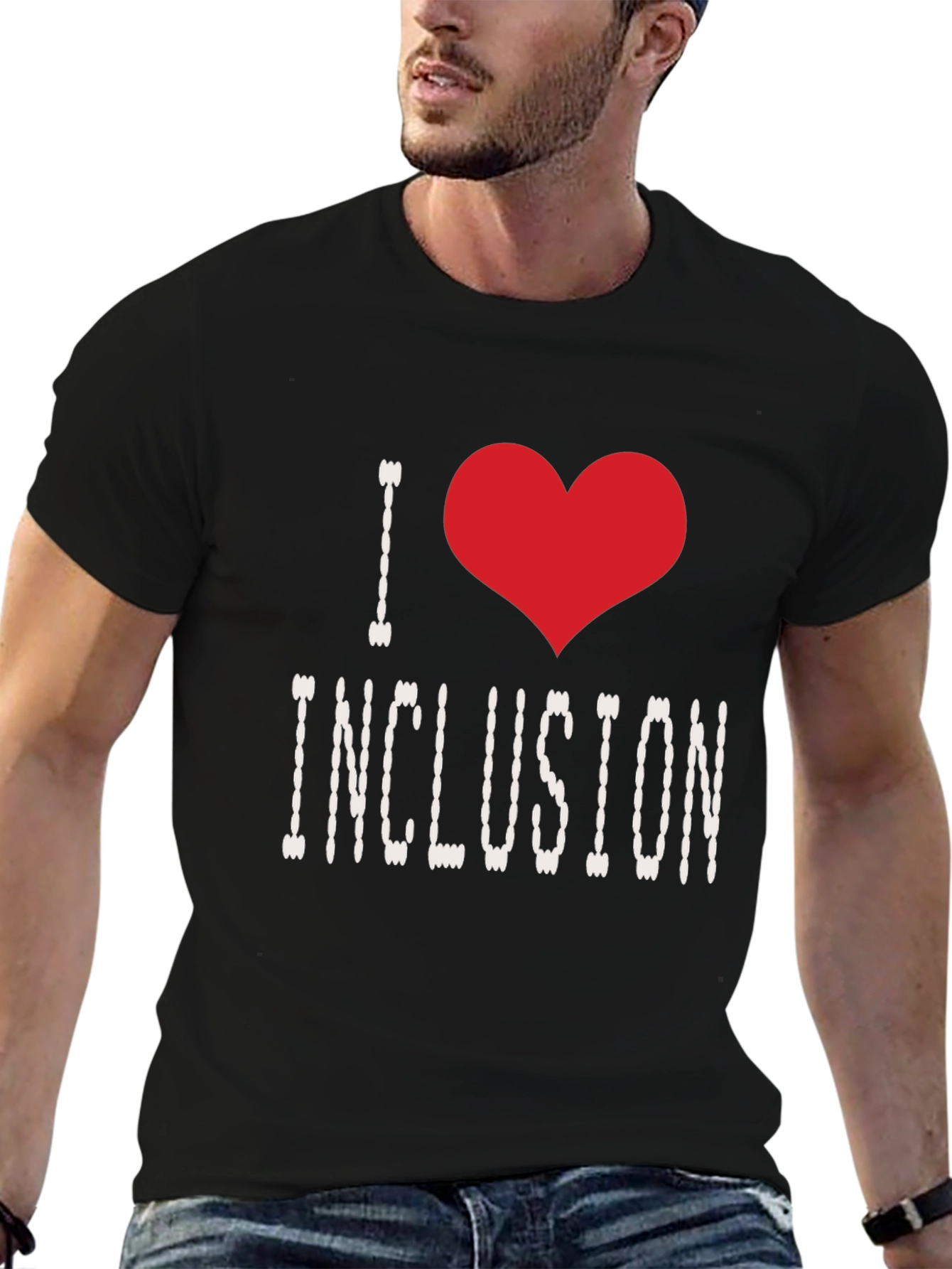Show your support for inclusion with this stylish black t-shirt. The design features the phrase "I [Heart] INCLUSION" in white with a vibrant red heart symbol. The shirt appears to be made from a comfortable cotton blend, perfect for everyday wear. This tee is ideal for raising awareness and promoting a positive message. Wear it to school, work, community events, or anywhere you want to spread a message of acceptance. Makes a great gift for advocates and allies. Get yours today!