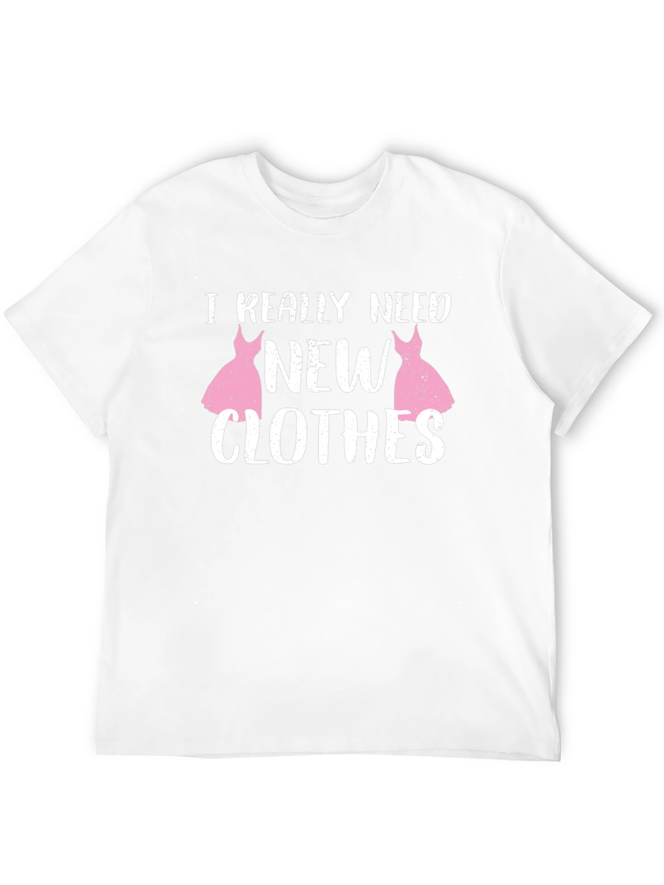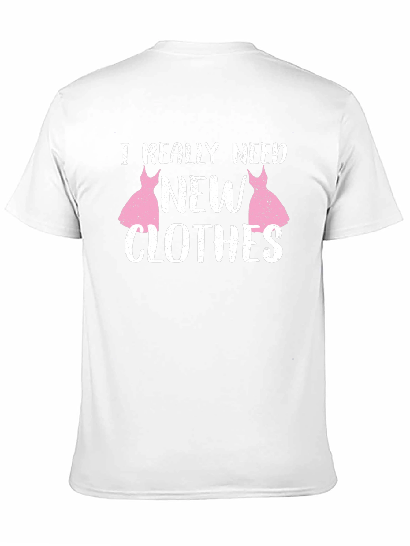 Express your love for fashion with this stylish black t-shirt! Featuring the playful phrase "I Really Need New Clothes" in bold white text, playfully accented with charming pink dress graphics. This tee combines comfort with a touch of humor. Made from soft, breathable fabric, it's perfect for everyday wear, casual outings, or a fun gift for the fashionista in your life. Pair it with your favorite jeans, shorts, or a skirt for an effortlessly chic look. This shirt is sure to turn heads and spark conversation.