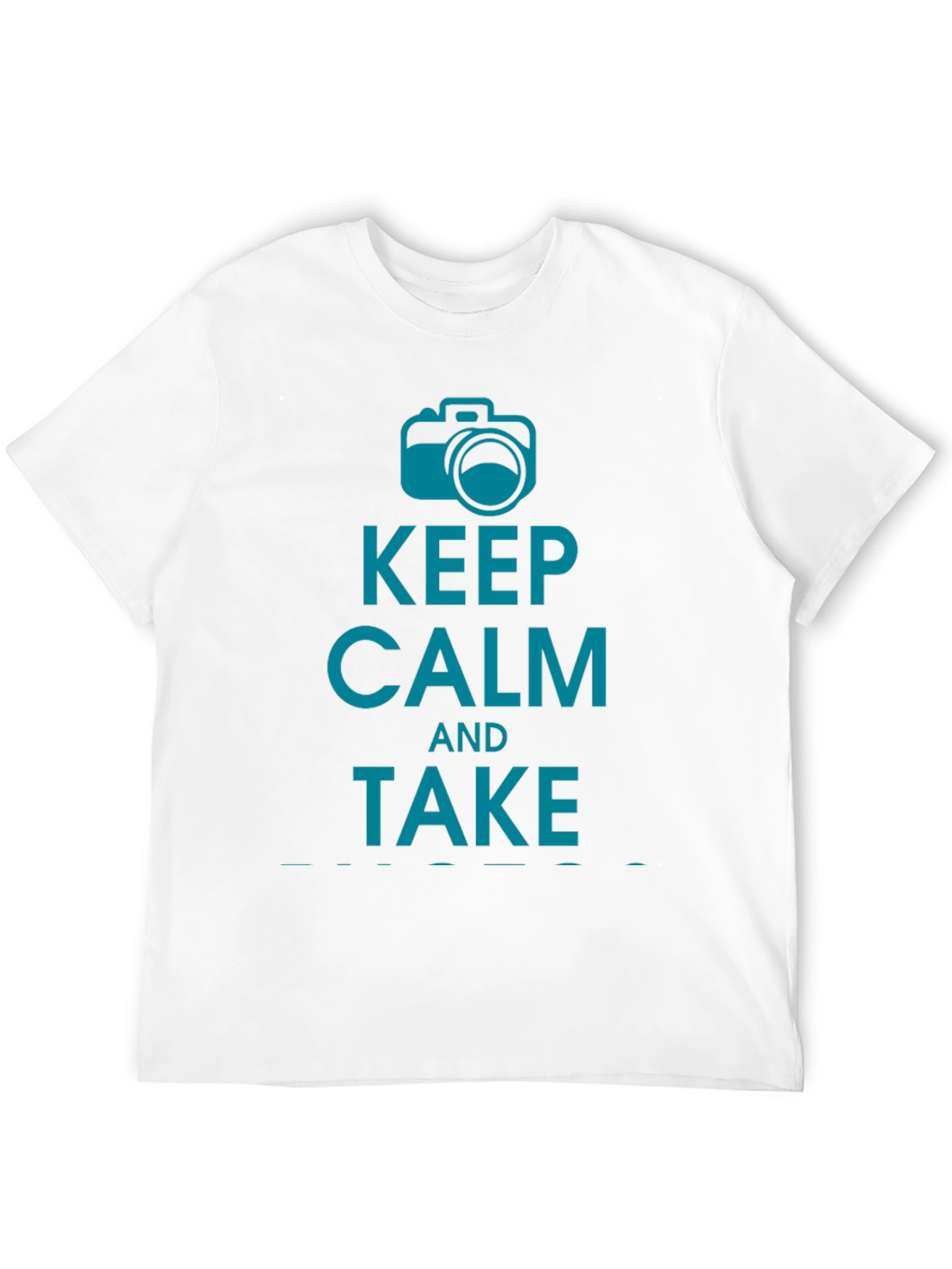 Capture the moment in style with this eye-catching graphic t-shirt. Made from soft, comfortable fabric, this black tee features a teal design with a camera icon above the humorous phrase "Keep Calm and Take Photos." The classic fit and short sleeves make it perfect for everyday wear, whether you're out exploring new places or simply relaxing at home. Show off your love for photography and spread some positive vibes with this unique and stylish tee. This shirt is sure to be a conversation starter and a favorite in your casual wardrobe.