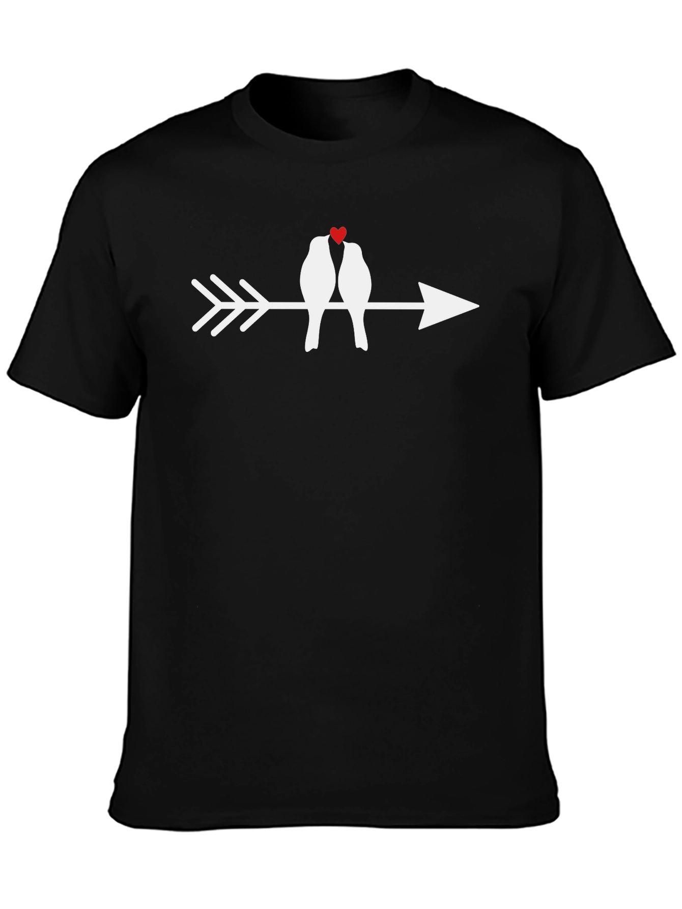 Show your affection with this stylish black t-shirt featuring a charming graphic. Two white birds perch sweetly on a white arrow, connected by a red heart, creating a lovely and unique design. Made from a comfortable fabric blend, this tee is perfect for casual wear, date nights, or Valentine's Day. The classic crew neck and short sleeves ensure a relaxed fit. Express your love subtly and fashionably with this eye-catching statement piece. Ideal for everyday use, this shirt also makes a thoughtful gift for your loved one. Stand out from the crowd and wear your heart on your sleeve!