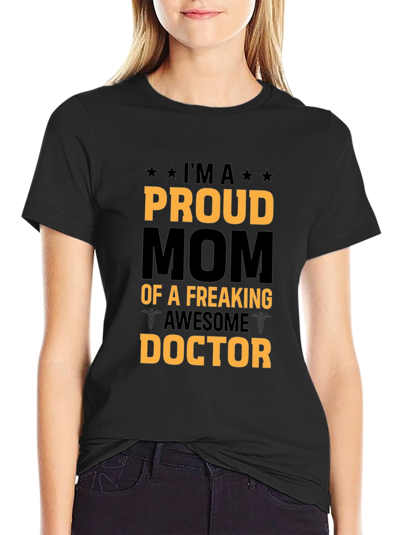 Show your pride with this bold black t-shirt. Featuring a striking golden-yellow and black graphic print, it proudly proclaims "I'M A PROUD MOM OF A FREAKING AWESOME DOCTOR". The design is eye-catching and perfect for casual wear. Made from a comfortable-looking fabric, this tee is ideal for everyday use, family gatherings, or supporting your amazing doctor child. Let everyone know how proud you are of their accomplishments with this unique and stylish t-shirt.