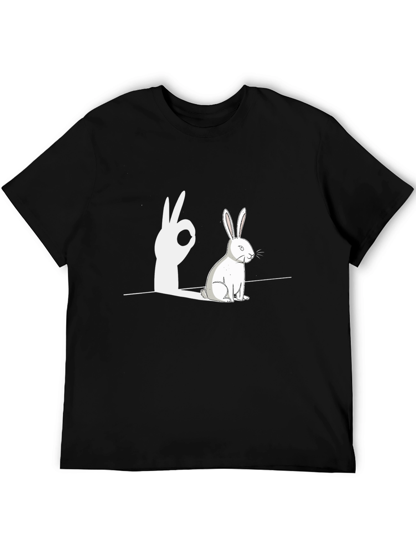 This sleek black t-shirt features a unique and playful graphic design. The design depicts a white rabbit sitting next to a hand shadow making the "OK" sign, creating the illusion of rabbit ears. It's a clever and eye-catching conversation starter. The t-shirt appears to be made of a comfortable, soft fabric, perfect for everyday wear. The design would appeal to those with a sense of humor or love of animals. Ideal for casual outings, quirky style, or as a fun gift.