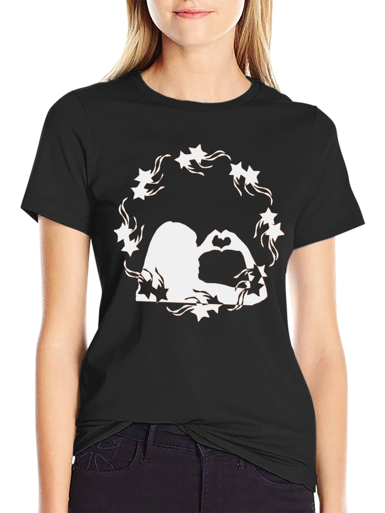 Show your love with this stylish black T-shirt! Featuring a unique white silhouette graphic of a couple framed by stars and foliage, forming a heart shape with their hands. The design is eye-catching and romantic, perfect for expressing your affection. Made from comfortable, breathable fabric, this tee is ideal for everyday wear or special occasions. Pair it with jeans or shorts for a casual yet trendy look. Stand out and make a statement with this unique tee. A perfect gift to a loved one!