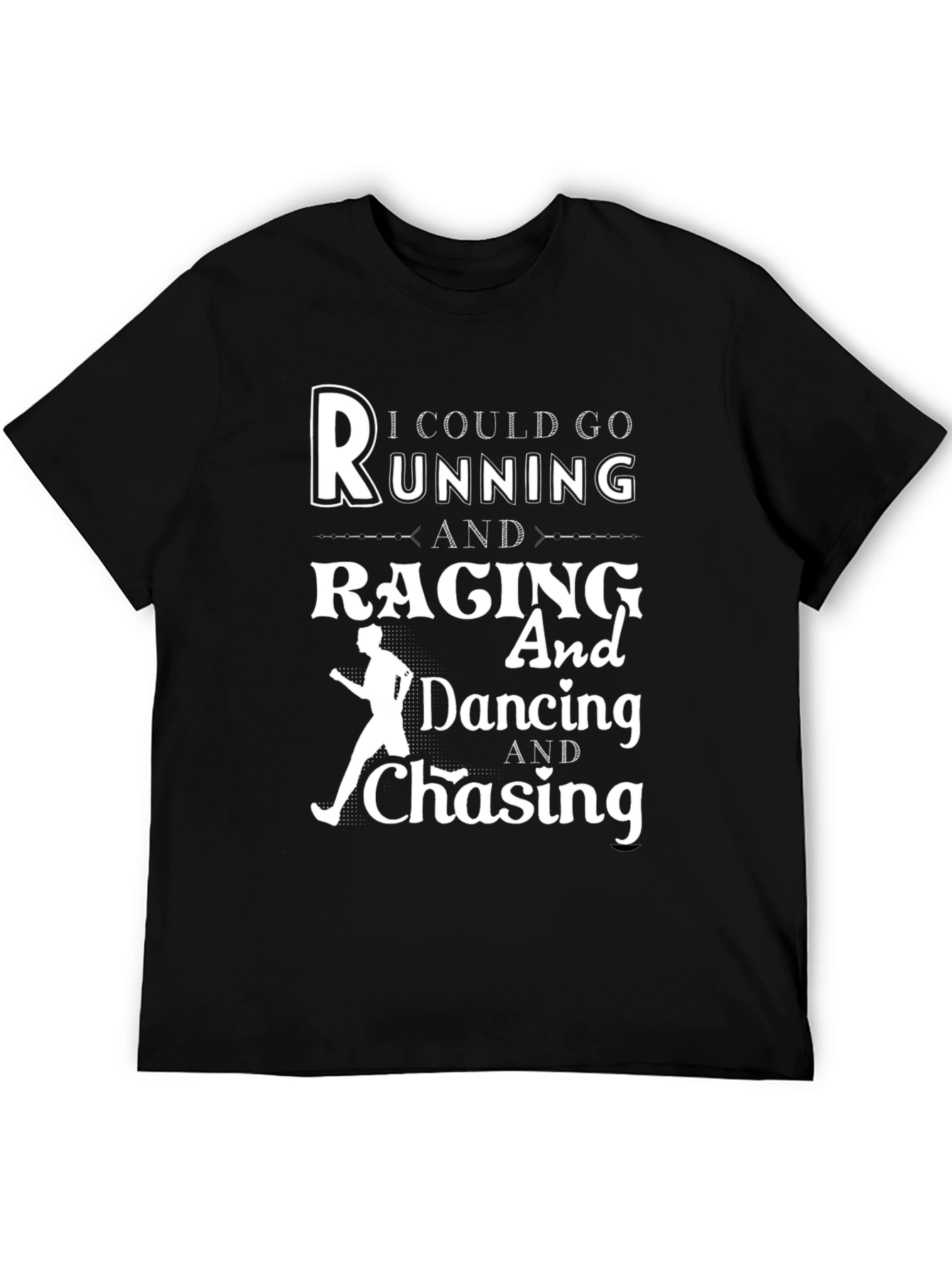 Show off your energetic side with this stylish black t-shirt! Featuring a bold white graphic, this tee boasts the playful text: "I COULD GO RUNNING AND RAGING And Dancing AND Chasing". A dynamic runner silhouette accents the design. The shirt appears to be made from a comfortable and breathable fabric, perfect for everyday wear or light workouts. This tee is ideal for anyone who loves to express their active and fun-loving personality. Pair it with jeans, shorts, or leggings for a casual yet eye-catching look. Get ready to turn heads and inspire others with this unique and motivational t-shirt!