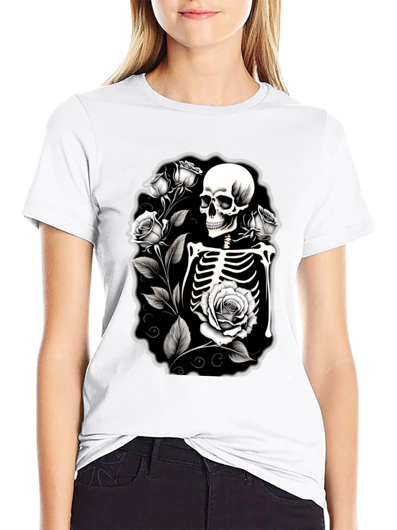 Embrace edgy style with this striking black t-shirt. The focal point is a detailed graphic featuring a skeleton intertwined with roses, creating a compelling visual contrast. The black backdrop enhances the monochromatic design, making it pop. Crafted from a comfortable material, this tee is perfect for everyday wear or making a statement at casual events. Pair it with jeans or shorts for a cool, relaxed look. Ideal for those who appreciate gothic aesthetics or unique artwork, this tee will add a touch of rebellious flair to your wardrobe.