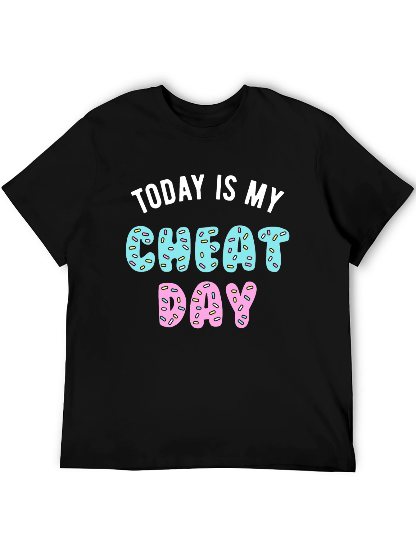 Indulge in sweet style with this fun 'Today is My Cheat Day' t-shirt. The bold statement design features playful donut-themed lettering in eye-catching colors. Soft fabric ensures all-day comfort, perfect for workouts, casual outings, or lounging at home. Show off your foodie side and treat yourself with this fun and stylish tee.